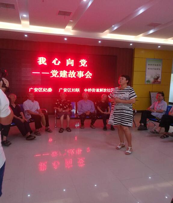 2018年6月28日,广安区妇联与广安区纪委、中桥街道办事处解放社区联合举办了“我心向党——党建故事分享会”。分享会上,社区党员们讲述了自己的成长历程,讲述了自己的入党故事,值此党的96岁生日之际,这些基层党员们用自己的行动号召广大党员坚定理想信念,以实际行动践行对党的誓言。